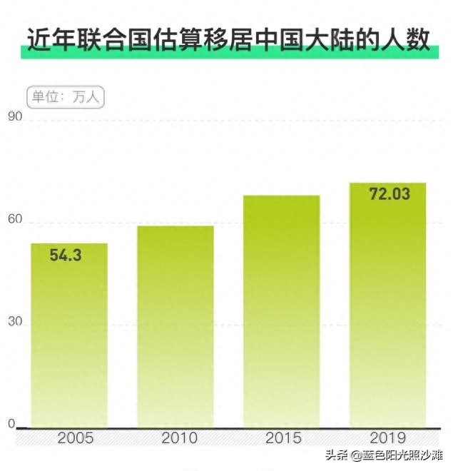 从联合国对移民中国的外国人的估算数据来看,2010年联合国估算的数据与第六次人口普查相近,而在2019年,中国境内的外国移民人数仅有720307人,比2010年增加了仅12.6万人。而去年1月份,《解放日报》援引国家外国专家局统计显示,在沪工作的外国人数量为21.5万,占全国的23.7%,居全国首位。按此估算,在华工作外国人数在去年达到了90多万。这也就是说,目前预估有超百万的外国人在华工作、留学。