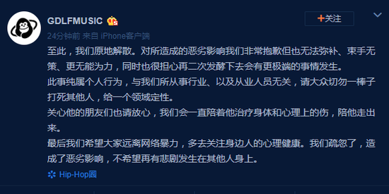 GDLFMUSIC 发文宣布红花会解散,并表示会陪在贝贝身边,帮他走出来。使得许多路人表示转粉了。不过,红花会的解散已成事实。