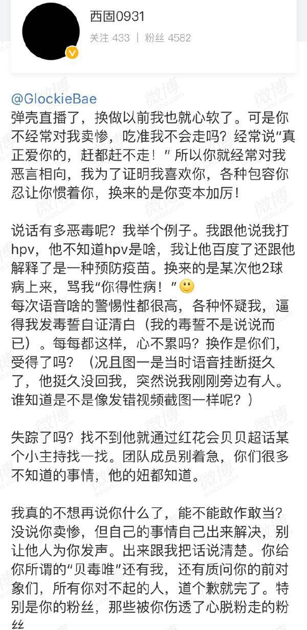 怎么好好的突然直播剁手指?粉丝似乎给出了答案,贝贝因为一个女人神智出现了问题,搜索了一下,该女子代号“西固”,是贝贝的粉丝,这位粉丝是和偶像有联系的,他们认识。