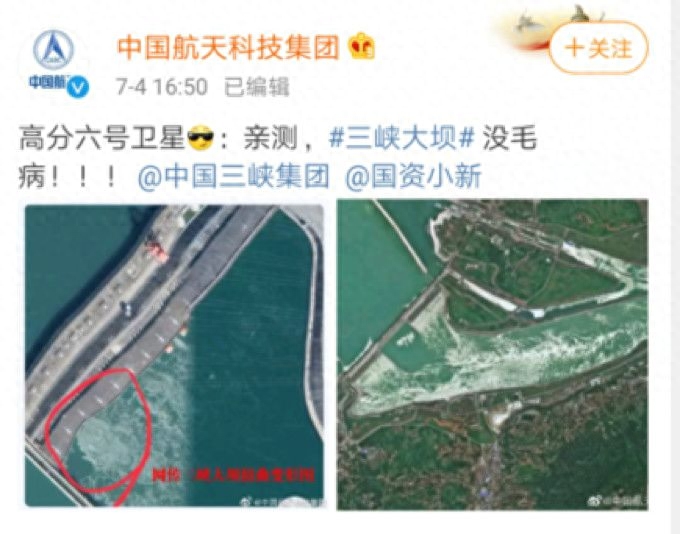 7月4日,中国航天科技集团也出面辟谣,专门拿出我国高分辨率、高质量成像、高效能成像的“高分六号”卫星,以一种“用牛刀杀鸡”的方式,展现了并无异常的三峡大坝的图片,再一次澄清了此事。