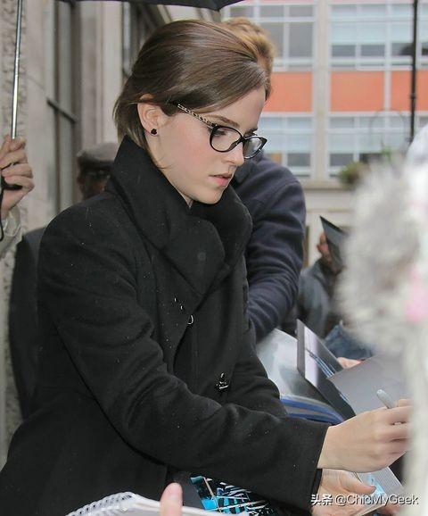 2012年艾玛·沃特森结束BBC电台的工作,从工作室出来后,也不吝啬地帮在外等待的粉丝签名,将短发随性放下的她,戴着眼镜显得相当随性。