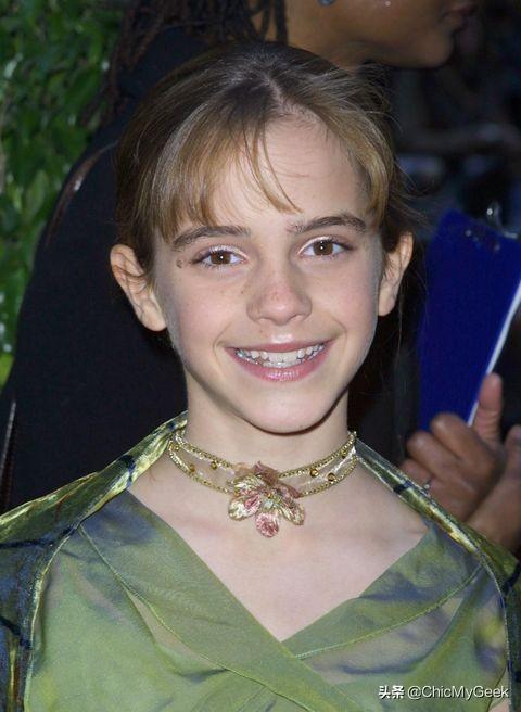 艾玛·沃特森2001年出席《哈利·波特与魔法石》纽约的首映时,将刘海分边,头发往后绑,非常符合年纪,青春烂漫。