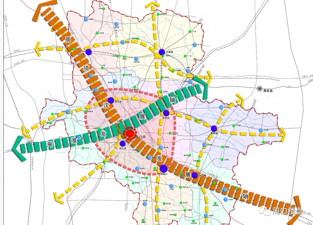 周口市城市总体规划(2014-2030)指出,周口空间发展战略——东拓西控、南联北伸,规划周口市域城镇体系空间结构为“一核(周项淮西一体化的组团城市)两轴(周项沈发展轴和周淮发展轴)网络化”的网络化结构,形成城乡一体、布局均衡的城镇空间发展格局。