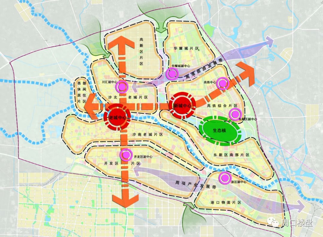 其中周口中心城区空间结构规划图分为九个主要片区,即沙南老城片区、沙北老城片区、市经济开发区片区、高新区片区、高铁综合片区、华耀城片区、东新区南部片区、港口物流片区和西部休闲居住片区。