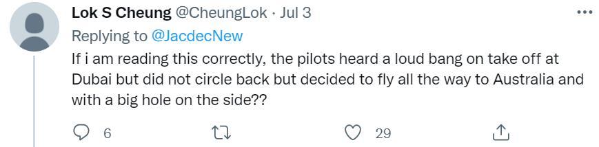 如果我没看错,飞行员在迪拜起飞时听到一声巨响,但没有返航,而是决定一路飞到澳大利亚,就带着侧面这个大洞?