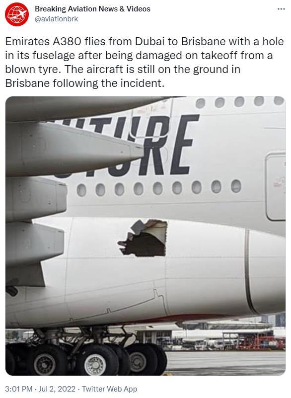 据阿联酋航空的发言人也表示,这些破损未对飞机机身、框架和结构产生任何影响,全部人员平安。