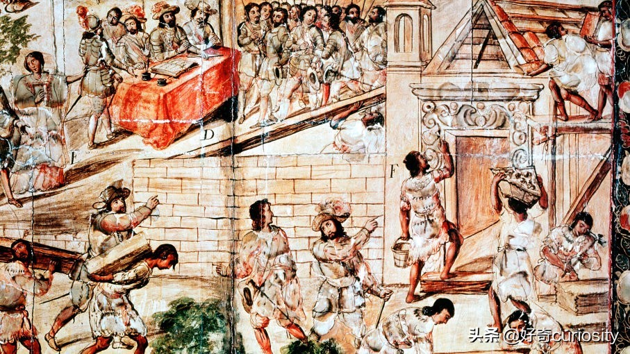 西班牙征服者奴役阿兹特克人在阿兹特克首都特诺奇蒂兰的废墟上建造墨西哥城。