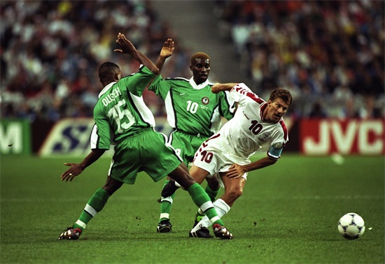 两年后,在法国举行的世界杯赛上,尽管尼日利亚队再次跻身十六强,但除了小组赛首场3:2击败西班牙队外,并无太多亮点,1/8决赛1:4溃败劳德鲁普兄弟领衔的丹麦队脚下,令人大跌眼镜。但这并没有影响球迷对他的喜爱,因为在比赛中他标志性的球技和带球总能给球迷们带来乐趣。