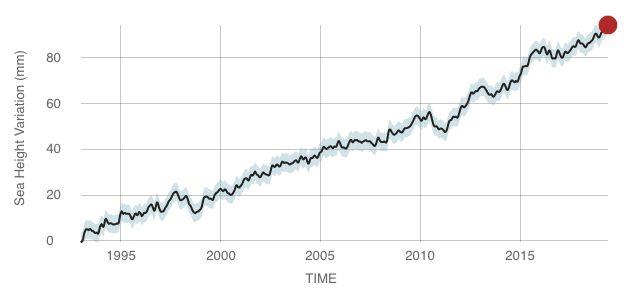 上图由美国国家航空航天局地球观测站根据美国国家海洋和大气管理局(NOAA)和澳大利亚联邦科学与工业研究组织(CSIRO)的数据制作。这些历史数据大部分来自潮汐仪的测量,现在已通过卫星观测加以补充。