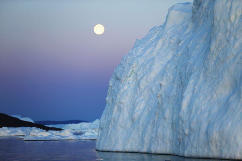 满月照耀着打破格陵兰岛雅各布港冰川的冰山。如果整个格陵兰岛冰盖融化,海平面将上升约6米或20英尺。(照片:乔·雷德尔/盖蒂图片社)