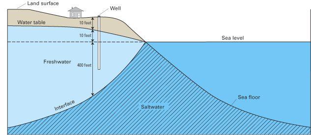 海平面上升可以帮助更多的盐水渗透到淡水含水层中。(插图:Paul M. Barlow / USGS)