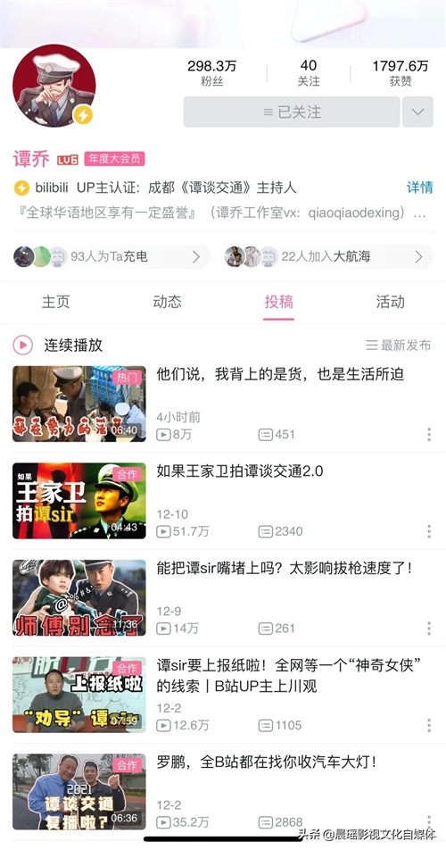 《谭谈交通》停播之后,节目片段被UP主搬上B站,谭乔转型做了UP主(上传视频的人),靠着发布《谭谈交通》以前的视频存货,谭乔在B站上收获了近298.3万粉丝。