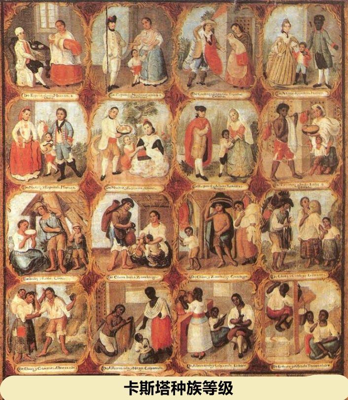 在西属美洲,整体而言,西班牙移民、意大利移民等白人移民在人口数量上并不占绝对优势,尽管印第安人后来人口锐减,但是在拉丁美洲,印第安人的人口基数庞大,在一些印第安人稠密区,已经有了复杂的经济和组织机构。基于上述情况,从一开始,西班牙殖民者就把美洲原住民甚至黑人纳入了殖民地统治体系。一看混血人口增多,为了保证西班牙殖民者的地位,西班牙在西属美洲制定了一套叫做卡斯塔的种族等级体系,赋予每个种族不同的社会经济地位,同时详细规定了不同种族结合后的后代的名称和地位,比如父母一方是西班牙人,另一方是印第安人,他们的后代叫梅斯蒂索人,父母一方是西班牙人,一方是黑人,他们的后代叫穆拉托人,比如父母一方是印第安人,一方是黑人,所产生的后代叫桑博人,来自西班牙本土的纯种白人以及在美洲所出生的纯种白人地位最高,基本不用交税和服役,而黑人和桑博人地位最低。