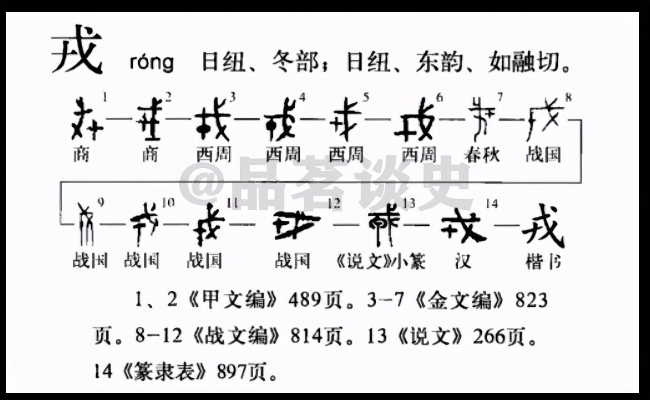 戎,会意字,在书中描写得很清楚“有人曰大行伯,把戈”,甲骨文中是由"戈"和一个十字符号构成,"戈"本义是古兵器;而这个十字符号应该就是人的意思,就像一个人在手持着戈在站立着。