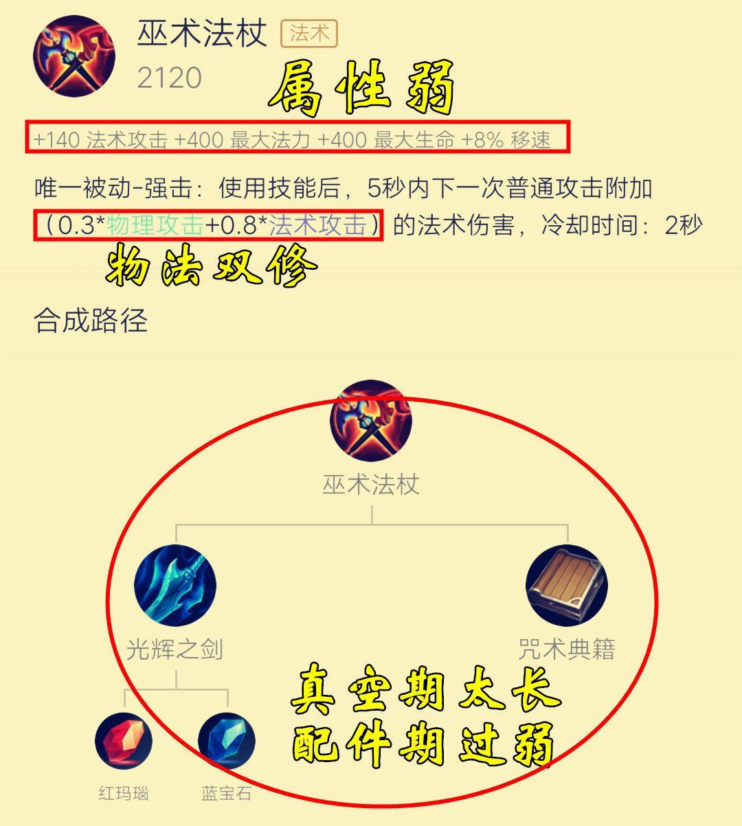 性价比过低:从它高昂的价格与寒酸的属性很容易总结出这一条足以宣判其死刑的缺点合成期长且弱:巫术法杖由光辉之剑以及咒术典籍合成,配件期战斗力极弱。并且在配件拉满之后,还需要1090的金币才能合成,真空期实在太长受用群体过少:强击被动受到双加成,然而物理英雄没法强,大部分法师不普攻冲突:本来适用群体已经够拮据了,然而巫术法杖还需和同定位的符文大剑争取这一小部分物法双修的英雄