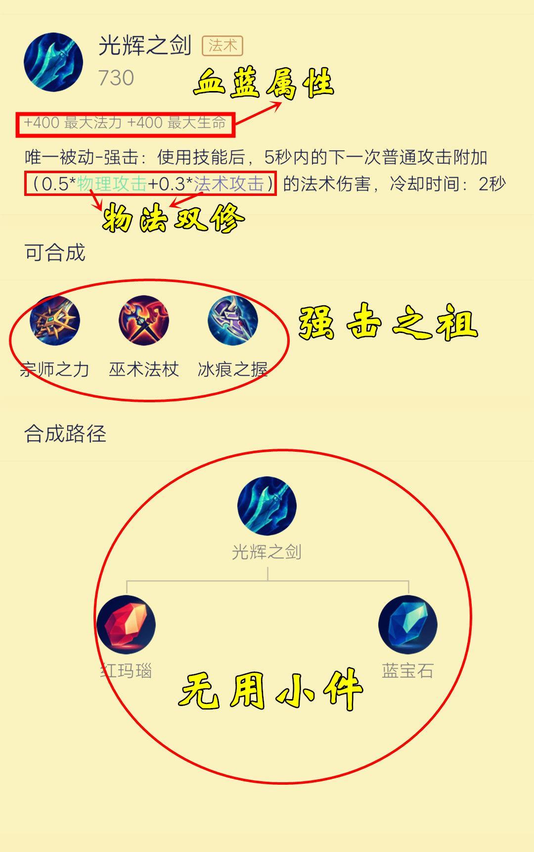 光辉之剑属于法装,价格730金币,由红玛瑙和蓝宝石合成,能够为使用者提供400点血蓝属性;其唯一被动强击的效果是使用技能后的5秒内强化下一次普攻,附带0.5ad+0.3ap加成的法术伤害,冷却时间2秒。