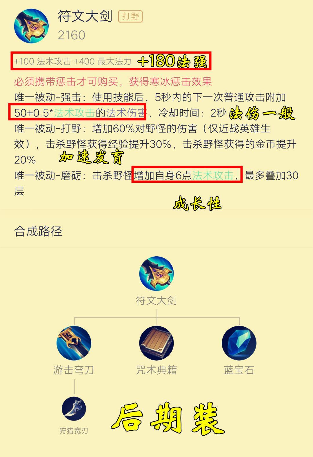 符文大剑是唯一不需要光辉之剑便能合成的强击装,同时也是唯一适合法师的打野装。其价格高达2160金币,能够为使用者提供100法强以及400最大法力,实战中它的属性还应考虑上磨砺被动,至多能够为使用者提供280法强和400法力,数值上仅次于贤者之书了。
