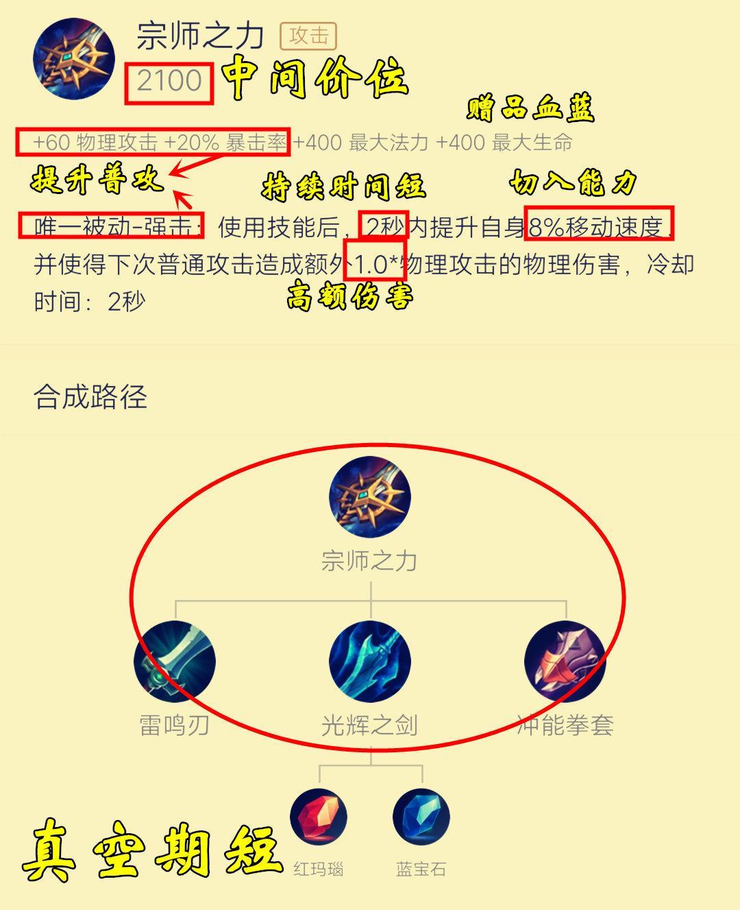 价格略贵:2100的价格在攻击装中属于中上游了,然而宗师对于攻击属性的提升却仅仅能够达到下游级别的电刀水平,并且囿于光辉之剑这一配件的限制,合成前的宗师会面临价高低能的窘境时间略短:宗师的强击buff仅会存在两秒,相比同类装备实在太短了加速略废:增加8%移速的效果看似不错,然而实战中由于触发机制和持续时间的限制,仅能在团战中起到作用,无法用于支援改动在即:宗师强击被动的ad加成将在下个版本中进行一波削弱,不过却提升了移速作为平衡。由于宗师的定位是爆发装,所以综合考虑下来,还是削弱了。
