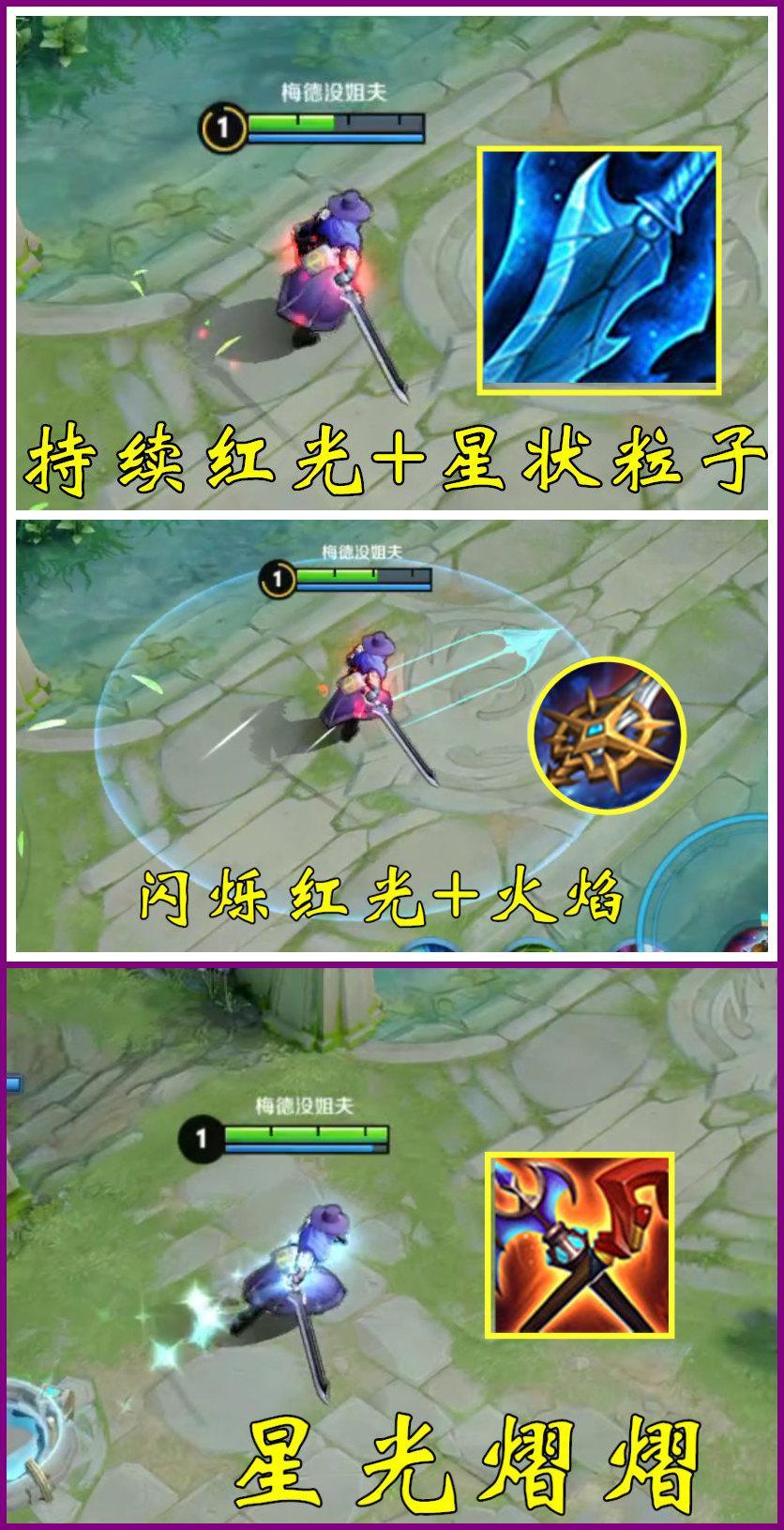 不同的强击装有着不同的外在表现,可根据这些特质来判断敌方英雄的出装阶段。比如光辉之剑的强击效果是使用者的手臂会出现持续的红色粒子特效,并且移动时会有红色碎屑掉落,持续5秒;而合成宗师之力后,使用者的手臂则会出现闪烁的红色例子特效,移动时手臂会有火焰状粒子特效,持续2秒;巫术法杖的强击被动特效十分显眼,使用技能后手臂会附带蓝光,并且有冰晶状碎屑不断掉落