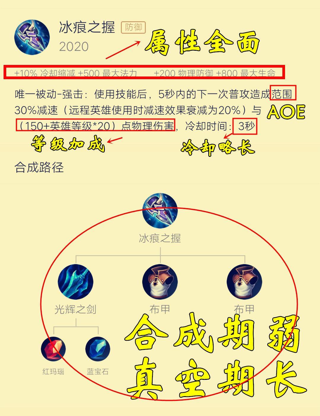 不精:属性看似全面,然而却样样不够用,肉度不及不祥征兆、冷却蓝量又不及极寒风暴不平滑:由光辉之剑以及两个布甲合成,配件期战斗力极差,并且购买了三个配件之后仍需850金币才能合成不好触发:虽有范围减速,不过触发方式却是主动普攻,比起被动触发的极寒风暴限制条件多了不少;成长性差:作为唯一不受ap或ad加成的强击装,到了后期之后冰痕之握的成长性很弱,到了后期伤害可以忽略不计,与宗师之力的输出差距明显节奏不好:被动冷却相比其他强击装要长1秒,实战中节奏不是很好版本不搭:在这个被称为互秒荣耀的时代,作为一件粘人装的冰痕之握注定不会热门