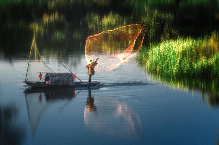 渔民撑着小竹排,湖面次次被泛起波澜,耳旁一片静谧,只听得水声当啷。
