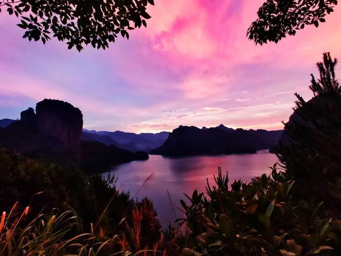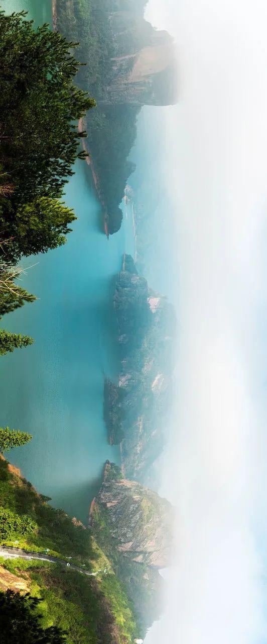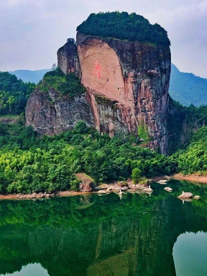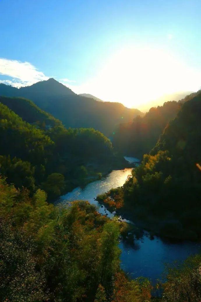 险峻青翠的山峦,曲折蜿蜒的绿水,开阔的水面上倒映着蓝天白云,幽静又空灵,诗人徐兆伦赞其“兀傲东南第一峰,半开灵境白云中”。