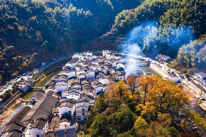 秋天的早晨,云雾在这肆意变幻游走,古徽州民居也升起袅袅炊烟,把成片的红色枫林包裹住,让人心甘情愿的沉沦。