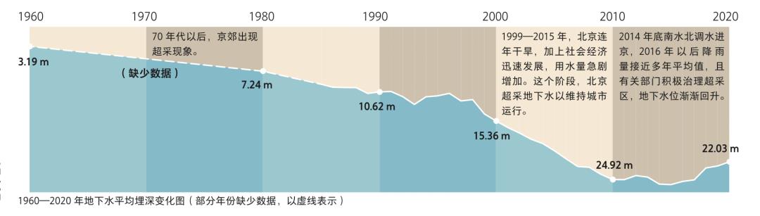 地下水从1960到2020的水位变化,从逐年减少,急剧下降,到2014年南水北调进京后水位回升。图/《京城绘》