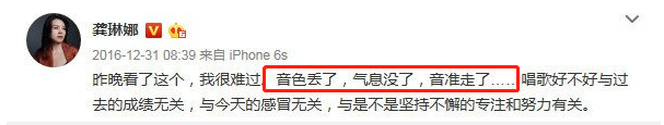 因《忐忑》一曲成名的龚琳娜也发声,"音色丢了,气息没了。"