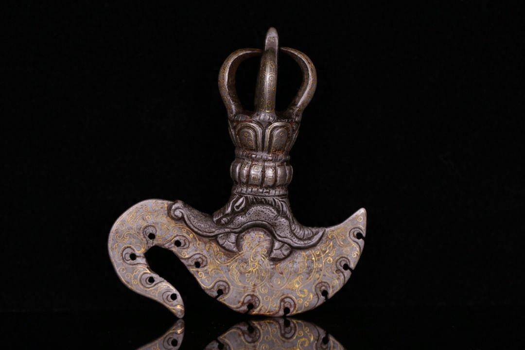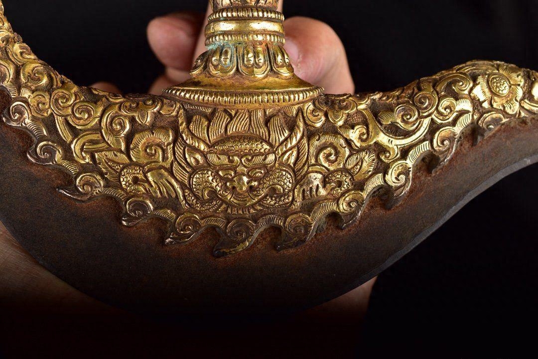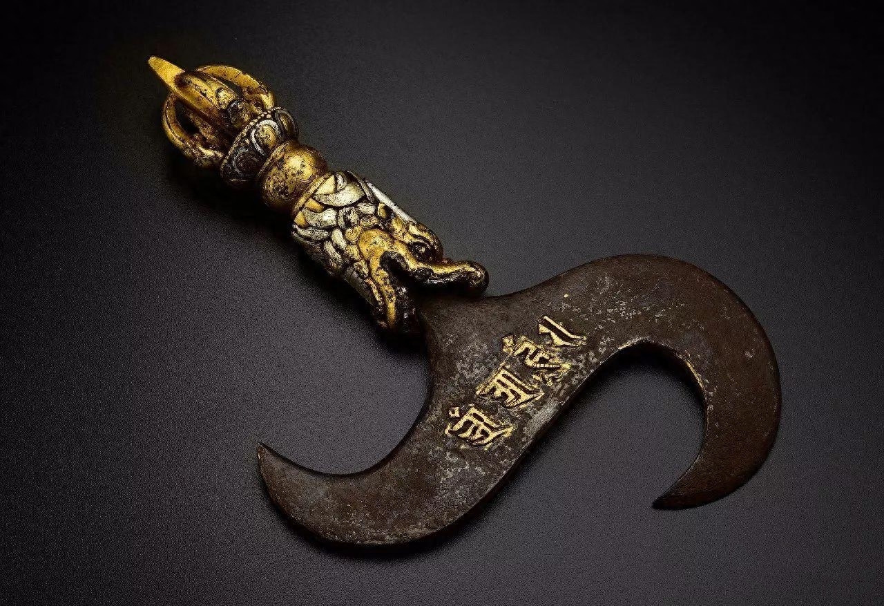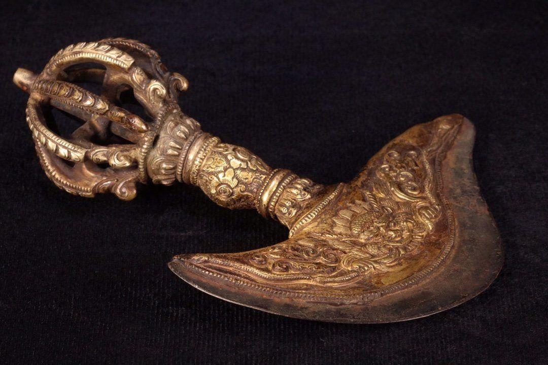 金刚钺刀,梵文译为Vajra Tomahawk,藏语“Trigug”又称为“空行母刀”是藏传佛教常见的法器之一,象征神圣佛法不容侵犯,卫护佛法之心。钺刀的型制与古代战场所用的斧极其相似,而钺刀不同的地方则是上端为金刚杵形,下端为斧状的刀刃和刀口。刀刃尾部有一点弯钩。西藏的《医学纲目》内也有用钺刀作为医用切割工具的记载。