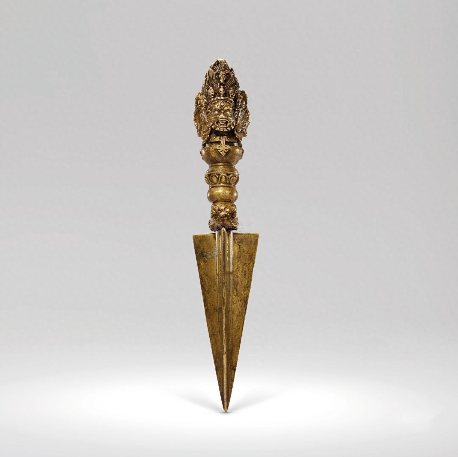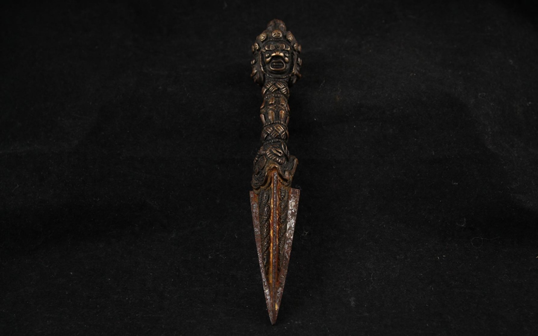 金刚橛,梵文译为vajvakilaka,音译为“伐迦罗羯罗迦”又称四方橛,和金刚杵一样在古印度时期是当做武器使用的。后融入古印度佛教流传到西藏。金刚橛的型制和匕首差不多,尖刃头加握柄。但与匕首的区别是金刚橛普遍握柄较长刃头较短。