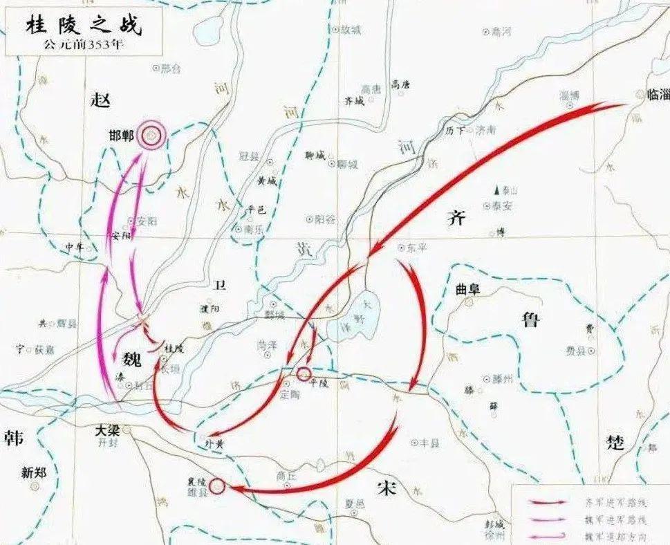 后来驺忌与田忌关系不好,公孙阅对驺忌说:"您为什么不考虑伐魏?那样,田忌一定领兵。如果战胜有功,那是您的计谋正确;如果打不胜,田忌不是向前死战就是向后败北,他的命就在您的手里了。"于是成侯向威王建议,派田忌南攻襄陵。十月邯郸被攻克,齐国趁机起兵进攻魏军,在桂陵大败魏军。于是齐国成为诸侯中最强的国家,自称为王,来号令天下。
