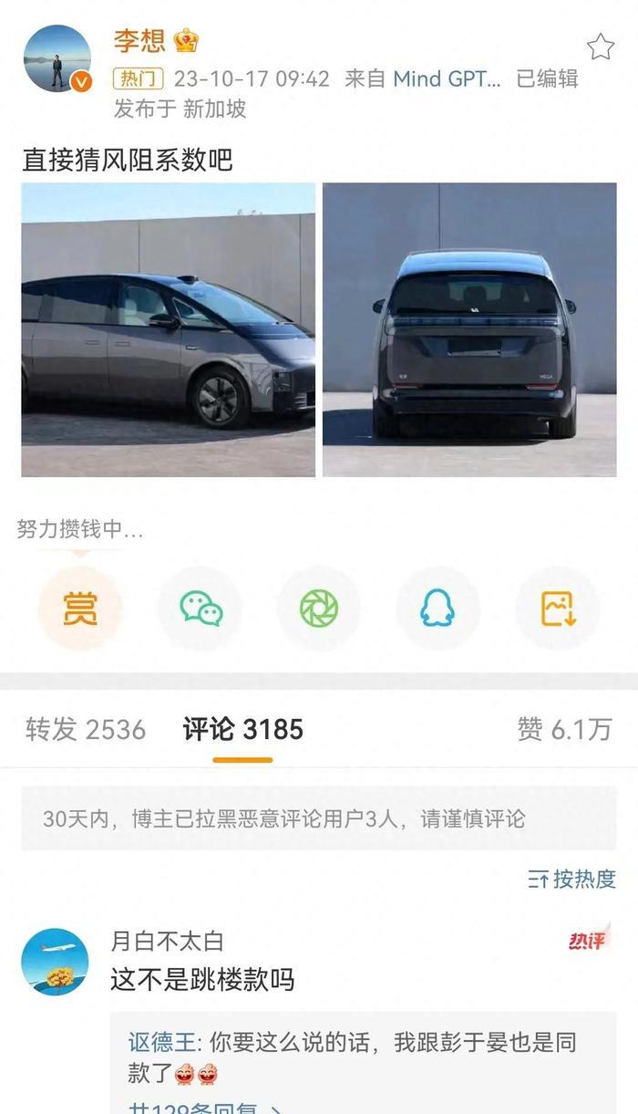 短短五个月后,随着官方放出实拍图,不少网友认为这和当时那位博主假想的渲染图差不多,便开始在李想的微博底下追问起“啥时候直播跳楼”。