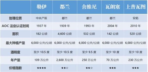 卢瓦尔河谷这 10 大产区虽然都是法定的长相思 AOC 产区,但所在的位置、最大种植产量和酒精度等方面也有所区别,如表所示: