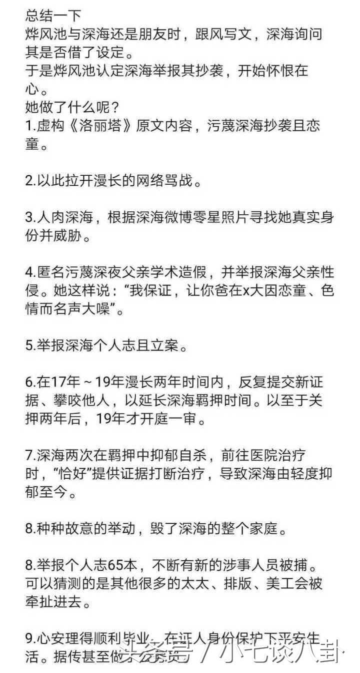 但值得注意的是,”烨风迟”并不是如网上所传抄袭了深海,她被判定抄袭的是另一位作者。当然”烨风迟”肯定是过错方。但是这件事成为了一地鸡毛的导火索。