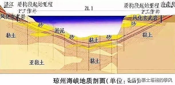 琼州海峡地质构造复杂,南北两侧多陡坎,陡坎最大高差达70m,坡度最大可达22~24度,而且海峡中间还有海沟,海水最深处达160米左右,根据地质结构,港珠澳大桥采用的沉管法已不适用,只能采用盾构法施工。用盾构机从两岸相向掘进深挖,然后中间合拢。