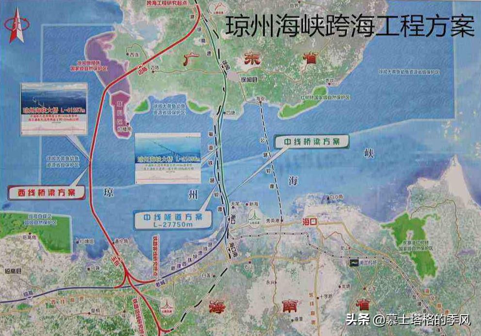 第一个是西线的公路铁路合建通道方案,从徐闻县的灯楼角到澄迈的道伦角修一条全长约32公里,类似于后来港珠澳大桥采用的桥梁+隧道模式,该方案的优势是深度浅,最大水深仅为五十五米,海底较为平坦,缺点是跨海工程长,两岸连接处绕行多,主体和引线工程投资都比较大,而且还要穿过徐闻珊瑚礁国家级自然保护区,总投资1400多亿。