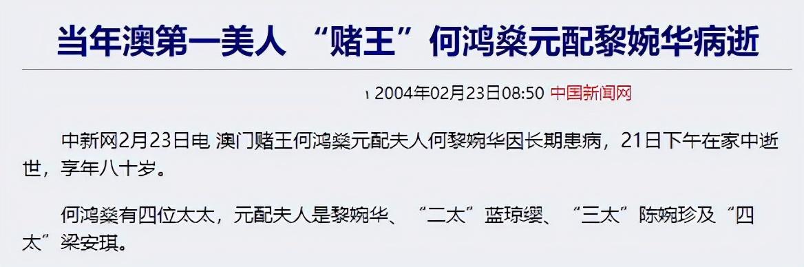 2004年,黎婉华去世留下的遗言是让何鸿燊照顾好剩下的两个女儿和两个孙女。