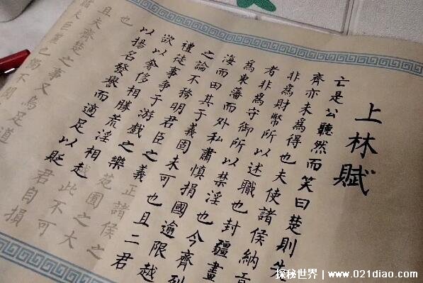 2、上林赋的书写难度非常大,《上林赋》是西汉辞赋家司马相如创作的一片赋,共2691个字,其实原文并不是表达感情,而体现的是讽谏当时的时政内容与讽谏的艺术手段,至于上林赋为什么写给心上人?就是因为篇幅比较长,而且生僻字极多,想要完整无误的写出来非常难。
