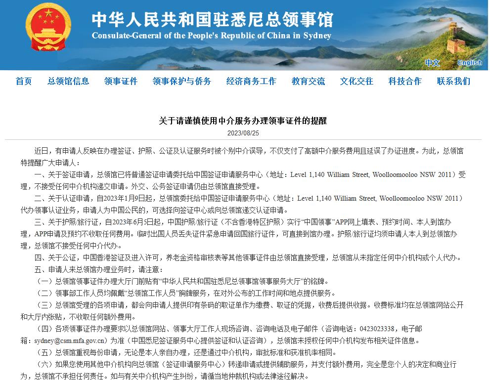提醒称,近日,有申请人反映在办理签证、护照、公证及认证服务时被个别中介误导,不仅支付了高额中介服务费用且延误了办证进度。