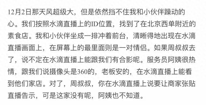陈菲菲提到,他们按照水滴直播上的ID位置,探访多家饮食店、健身馆等,发现顾客的身影清晰无误地出现在直播里,接受所有网友的观看与点评。