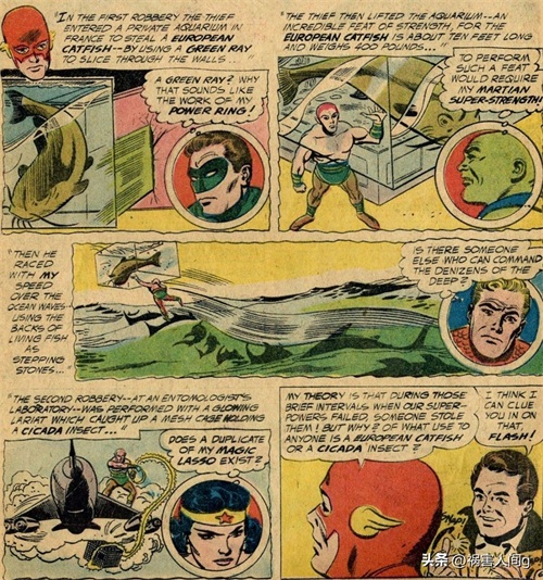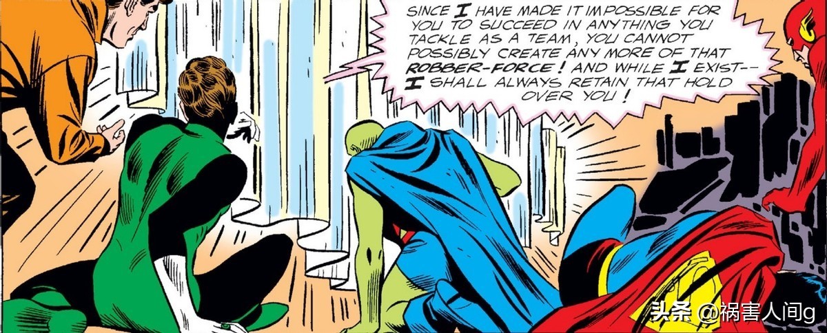 在1964年漫画《美国正义联盟》#27中,由于正义联盟合作使用能力时会形成一种“强盗能量(Robber-Energy)”,这种能量会威胁到一种叫作“我(I)”的近乎全能的宇宙种族,“我”使正义联盟成员无法同时使用力量。