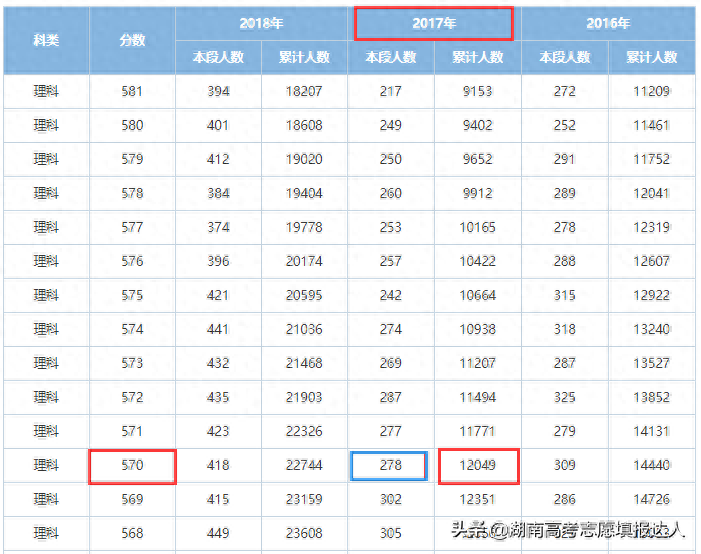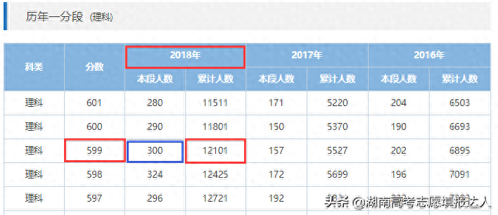 如上图所示。有湖南理科近三年一分段数据对比。2016年第一名是696分,2017年第一名是698分,2018年第一名是701分。【备注:2018年5月8日,在全国普通高校招生考试安全工作电视电话会议上,教育部部长陈宝生强调,各地严禁宣传“高考状元”“高考升学率”,一旦发现严肃处理。】所以我列举的只是显性的状元。其实这个分数之前的还有很多高分考生成绩没有在一分段公布。比如说2018年701分有2位同分的,但累积人数有20人,说明还有18位考生高出701分。