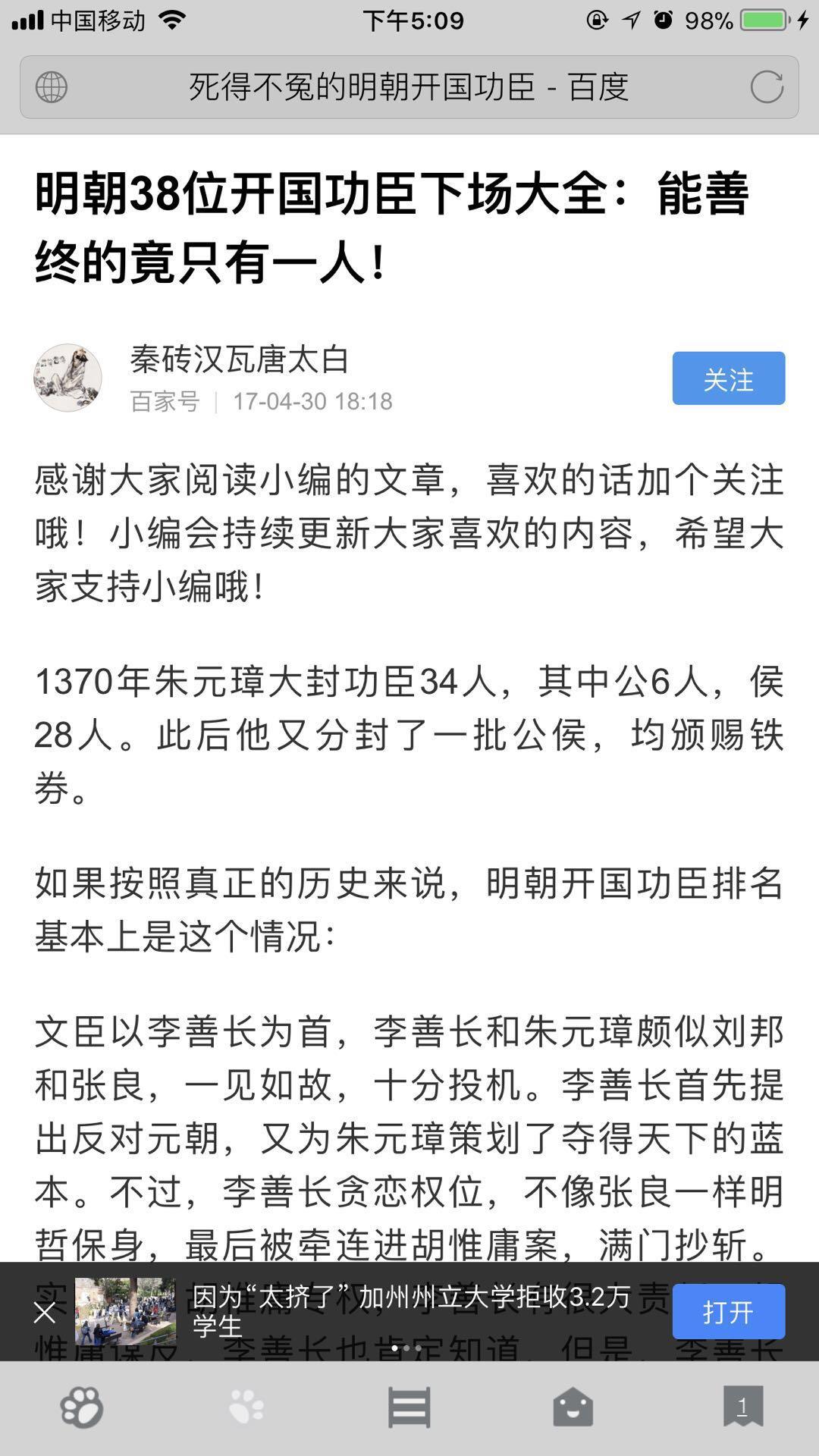 总评:明朝开国六公+刘伯温(论功可以封公爵)+开国28侯爵=35人,其中善终的公爵(含刘伯温)5人+善终的侯爵16人,存活率为60%,比想象中的要好一点,朱元璋杀开国功臣较多不假,但也没一些人说的那样夸张,杀得只剩下1人(只剩汤和或郭英),而且被杀的开国功臣里,确实有不少人按律是该杀的,比如:1)德庆侯廖永忠,僭用龙凤等违法之事被赐死。2)永嘉侯朱亮祖勾结地方豪强,污蔑朝廷命官道同致死,后被朱元璋鞭死。限于篇幅,就不一一列举了。