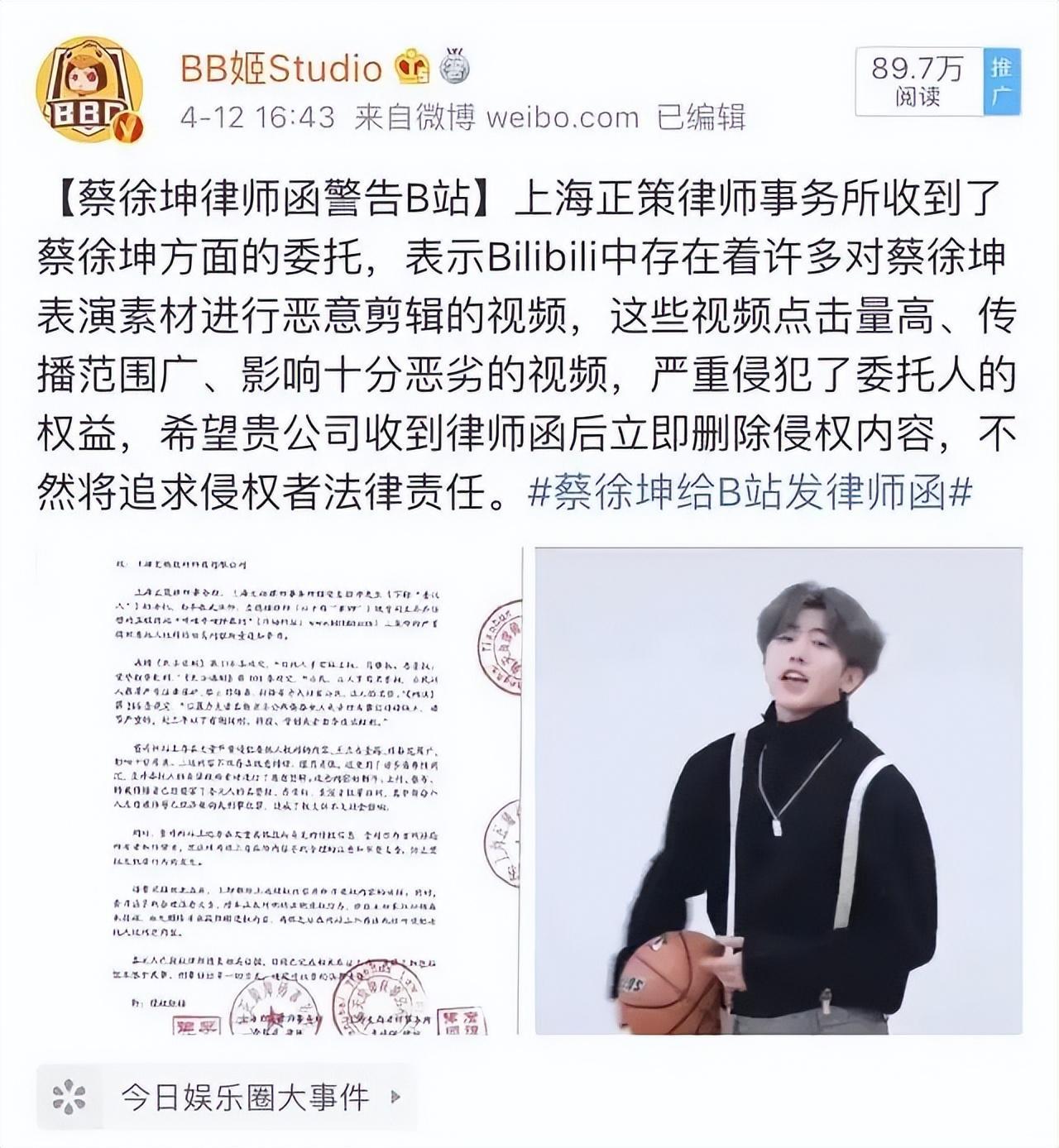 因为负面影响太大,针对一些特别过分的视频,蔡徐坤的工作室也发布了律师函。