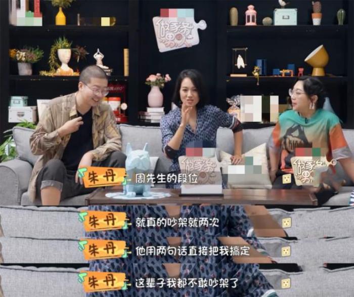 朱丹在主持时分享过她和周一围吵架的经历。"我们俩就真的吵过两次架,他用两句话直接把我搞定,这辈子都不敢吵架了。"