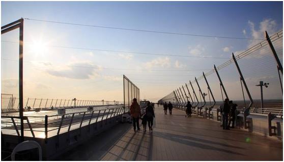 中心花园面向跑道突出。其顶层为观景台,是长300米的露天式平台,对机场的所有旅客免费开放。站在观景台最前端,离滑行道仅300米之遥,而距离飞机进入滑行道之前所处的跑道仅50米,是日本最近距离观测飞机之处。天朗气清之时,可以远眺三重县海岸线,以及来往于名古屋港的船只。黄昏时分,您还可以观赏夕阳和起降的飞机,独享只属于新特丽亚的美景。晴空碧海、飞机船舶……这气势磅礴的景色,定会成为您旅行中最美的画面。