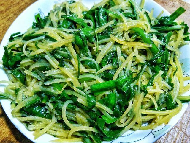 土豆去皮洗净切成丝,韭菜摘去老叶,洗净切段,炒锅置于旺火上,加入花生油,待油烧至四成热时,加入花椒炒出香味,然后将炸焦的花椒捞出,放入土豆丝煸炒,炒至断生时放入食盐,味精,炒匀后再放入韭菜,用旺火快速翻炒 ,当韭菜颜色变深绿起油光发亮时,放入味精,淋入香油。颠翻几下,出锅装盘即可