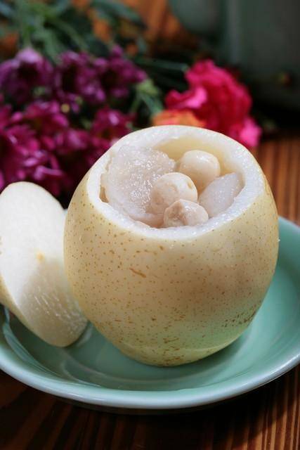 雪梨洗净切块,放入碗中,放入白砂糖和北杏仁,再加入少量水蒸一小时即可