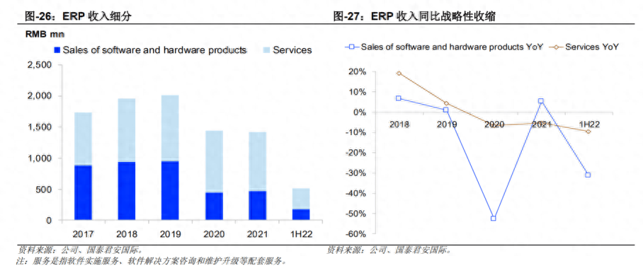作为国内ERP龙头,用友网络和金蝶的ERP收入增速近年来都出现了明显的下滑。
